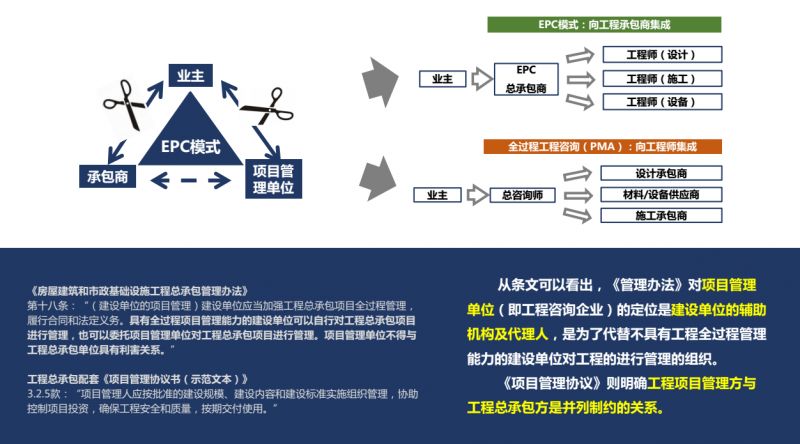 第三,EPC項(xiàng)目全過程工程咨詢。按我之前的想法,EPC是沒有全過程工程咨詢的。因?yàn)镋PC已經(jīng)被總承包商承包走了,還用得著全過程工程咨詢嗎?沒想到,出現(xiàn)了一個(gè)契機(jī)。在中國的EPC信任度不夠,所以采用的EPC集成形狀施嚴(yán)格管控之實(shí),成為中國特色的EPC。有什么特點(diǎn)呢?就是強(qiáng)化工程鐵三角關(guān)系,又恢復(fù)回去了,還是這三角。監(jiān)理弱化為項(xiàng)目管理單位,協(xié)助業(yè)主進(jìn)行項(xiàng)目管理。