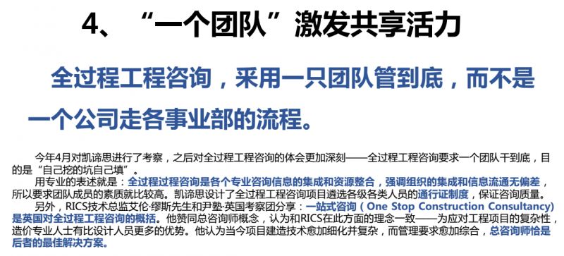 第四,“一個(gè)團(tuán)隊(duì)”激發(fā)共享活力。全過程工程咨詢,采用一支團(tuán)隊(duì)管到底,而不是一個(gè)公司走各事業(yè)部的流程,這個(gè)大家一定要牢記。在群雄都在爭全過程工程咨詢的時(shí)候,我要送給大家一句,“哥們,問題是投資。”只有我們才具備全過程投資管控的能力,但是我們的弱項(xiàng)在前期和現(xiàn)場。我們只要把這兩個(gè)短板(補(bǔ)上),或者我們不補(bǔ)這個(gè)短板,聯(lián)合監(jiān)理和設(shè)計(jì)企業(yè),我們就能做的更好。只有一支團(tuán)隊(duì)管到底,我們才能全過程工程咨詢做好。一支團(tuán)隊(duì)只能干一件事兒,你要干兩個(gè)全過程,你就要組織兩支團(tuán)隊(duì),以此類推。所以,工程造價(jià)咨詢企業(yè)的春天就要到來了,因?yàn)槟阋炎鋈^程工程咨詢的話,你就會(huì)有史無前例的改變,并且你會(huì)發(fā)現(xiàn)人馬會(huì)大量的增加,產(chǎn)值會(huì)大大上升。利潤率也會(huì)提高。