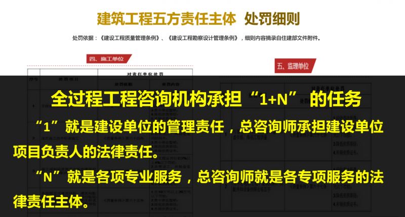 總咨詢師與各參與方的關(guān)系解析?次业臉(biāo)題,總咨詢師未破壞五方責(zé)任法律制度。五方責(zé)任主體,一方是建設(shè)單位項(xiàng)目負(fù)責(zé)人,一方是勘察單位,第三方設(shè)計(jì)單位,第四方施工單位,第五方監(jiān)理單位。我們沒有破壞,因?yàn)榭傋稍儙?ldquo;1”擔(dān)任的是建設(shè)單位項(xiàng)目負(fù)責(zé)人,承擔(dān)的建設(shè)單位法律責(zé)任沒有變化。“N”就是各項(xiàng)專項(xiàng)服務(wù),如果你承擔(dān)“N”,就是承擔(dān)各專項(xiàng)服務(wù)的法律責(zé)任主體,承擔(dān)幾個(gè)“N”,就有幾個(gè)法律主體。