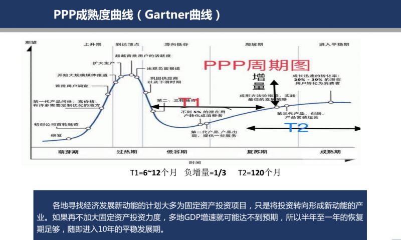借PPP模式是什么意思呢?大家看圖。財(cái)政部一抓PPP,在2016年就達(dá)到一個(gè)頂峰,然后下降,會(huì)再出現(xiàn)一個(gè)駝峰,駝峰只比頂峰差了1/3,但這個(gè)階段會(huì)持續(xù)10年。另外,我預(yù)計(jì)從今年年底到明年年初,就會(huì)大量的出現(xiàn)PPP。所以,我們一定要把PPP與工程咨詢結(jié)合起來。如果再不加大固定資產(chǎn)投資力度,多地GDP增速將可能達(dá)不到預(yù)期,所以半年至一年的恢復(fù)期之后,PPP將會(huì)進(jìn)入長達(dá)10的平穩(wěn)發(fā)展期。你們怎么能夠錯(cuò)過長達(dá)10年的機(jī)會(huì)呢?絕對不能錯(cuò)過。