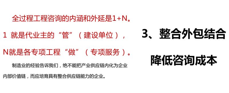 第三,全過程工程咨詢的內(nèi)涵和外延是1+N,1就是代業(yè)主的“管”,N就是各專項(xiàng)工程的“做”,管和做的結(jié)合。過去我們一直把1和N進(jìn)行簡單的疊加,在總咨詢班第四期,海天咨詢總咨詢焦凌和昆明華昆的劉興浩(音)把“+”給出了更好的解釋,提出來“+”就是平臺(tái),管和做都在平臺(tái)上,這個(gè)+才能真正的實(shí)現(xiàn),這個(gè)思路我覺得很好。這個(gè)“+”一定要上,而不是被動(dòng)的等待。絕不能把產(chǎn)業(yè)供應(yīng)鏈內(nèi)化為企業(yè)內(nèi)部價(jià)值鏈,而應(yīng)培育具有整合供應(yīng)鏈能力的企業(yè)。剛剛成立的聯(lián)盟(尹塾·新顧問全過程工程咨詢合作組織,整理者注)就是整合各種資源的一個(gè)具體措施。大家未來不應(yīng)該僅僅局限于工程造價(jià)咨詢?nèi),而?yīng)該放開眼界。