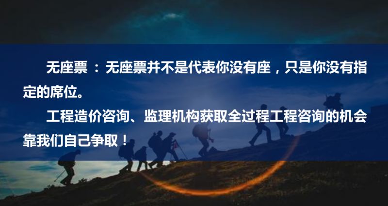 最后,我要說,現(xiàn)在我們沒座,因?yàn)槿^程工程造價(jià)不是龍頭,因?yàn)樵诮ㄔO(shè)部的文件里沒有把我們列為龍頭,好像是沒座。但是無座票并不是代表你沒有座,而是你沒有指定的席位。我們要靠自己去爭取,工程造價(jià)咨詢、監(jiān)理機(jī)構(gòu)獲取全過程工程咨詢的機(jī)會(huì)靠我們自己去爭。