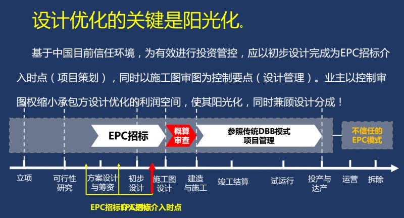 那么,我們對EPC項(xiàng)目全過程工程咨詢應(yīng)該怎么做呢?要在激勵(lì)的基礎(chǔ)上,嚴(yán)格管控,以控制審圖權(quán)縮小承包方設(shè)計(jì)優(yōu)化的利潤空間,使其陽光化,同時(shí)兼顧設(shè)計(jì)優(yōu)化的分成。這是我們的一個(gè)想法。為解決按功能清單發(fā)包,按功能計(jì)價(jià)與傳統(tǒng)工程量清單和定額計(jì)價(jià)依據(jù)的矛盾,EPC模式必須抓住項(xiàng)目策劃和設(shè)計(jì)管理且按功能計(jì)價(jià)。